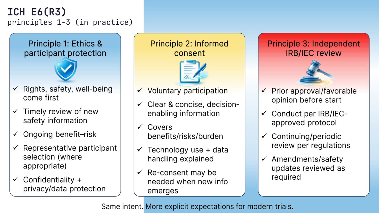 R3 makes it more explicit that ethics is continuous: timely review of new safety information, an ongoing benefit–risk view, representative participant selection (where appropriate), and protection of confidentiality/privacy.