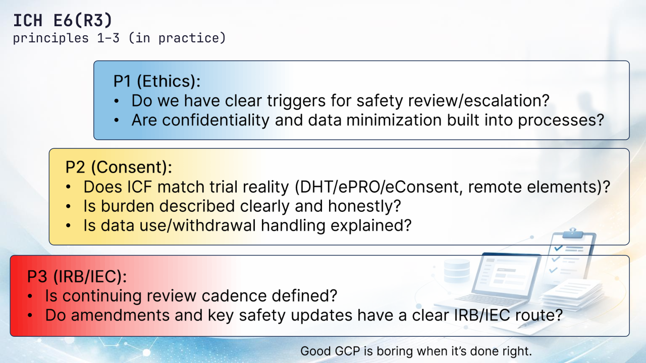 R3 pushes beyond formality: consent should reflect trial reality – benefits/risks/burden, technology use (eConsent/ePRO/DHT), data handling, and what happens if a participant withdraws. When new information could affect willingness to continue, re-consent may be needed, not just a document update.