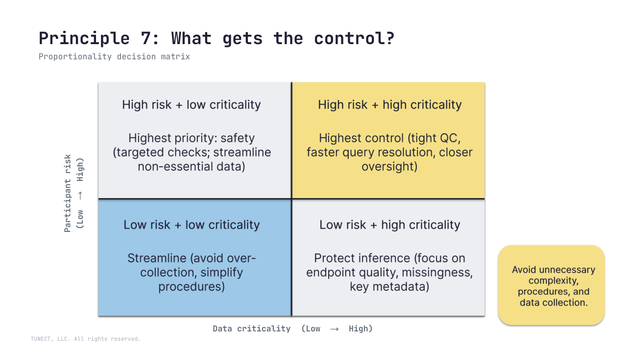 7) Risk-proportionate trial conduct (avoid unnecessary burden).